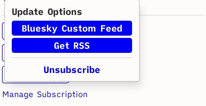 追記:「Manage Subscription」をクリックするとUpdate Options の項目が出てきて RSS登録と登録解除のほかに「Bluesky custom Feed」をクリックするとblueskyの Leaflet Reederに飛ぶ。