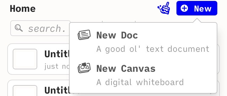 Newから「New Doc」新投稿欄、又は「New Canvas」キャンバスページ作成画面へ(まだ試してみた事がない)ここの画面から家マークをクリックすればHome画面に遷移する